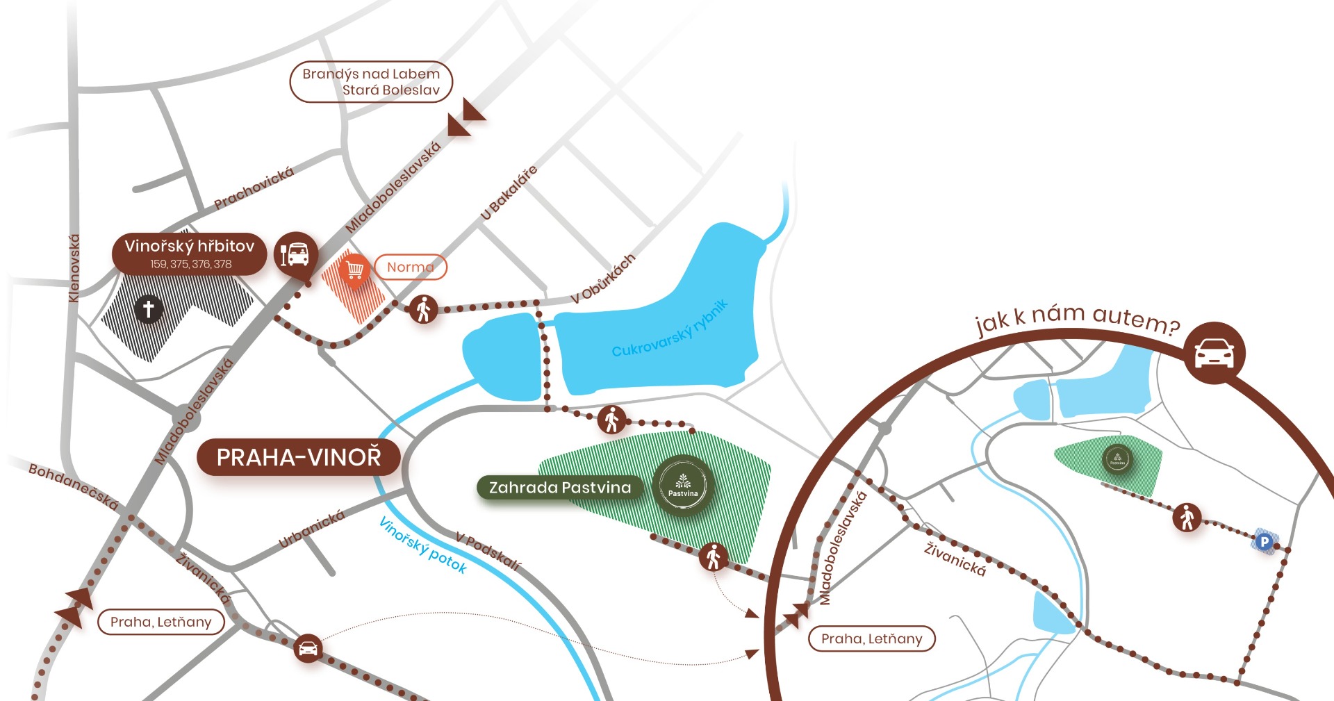 Po vystoupení z autobusu zamiřte k Normě, po její pravé straně vede cesta dolu k rybníkům. Přejděte po hrázi a po levé ruce ve stráni do kopce spatříte pěšinu, která vás k nám bezpečně dovede. (je tam i cedule, ale semtam nám jí někdo ukradne, tak na to raději nespoléhejte ;) )
